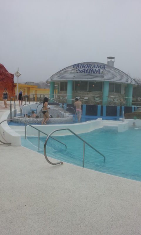 野外スパは残念ながら雨、屋内プールは沢山の人、人、人。