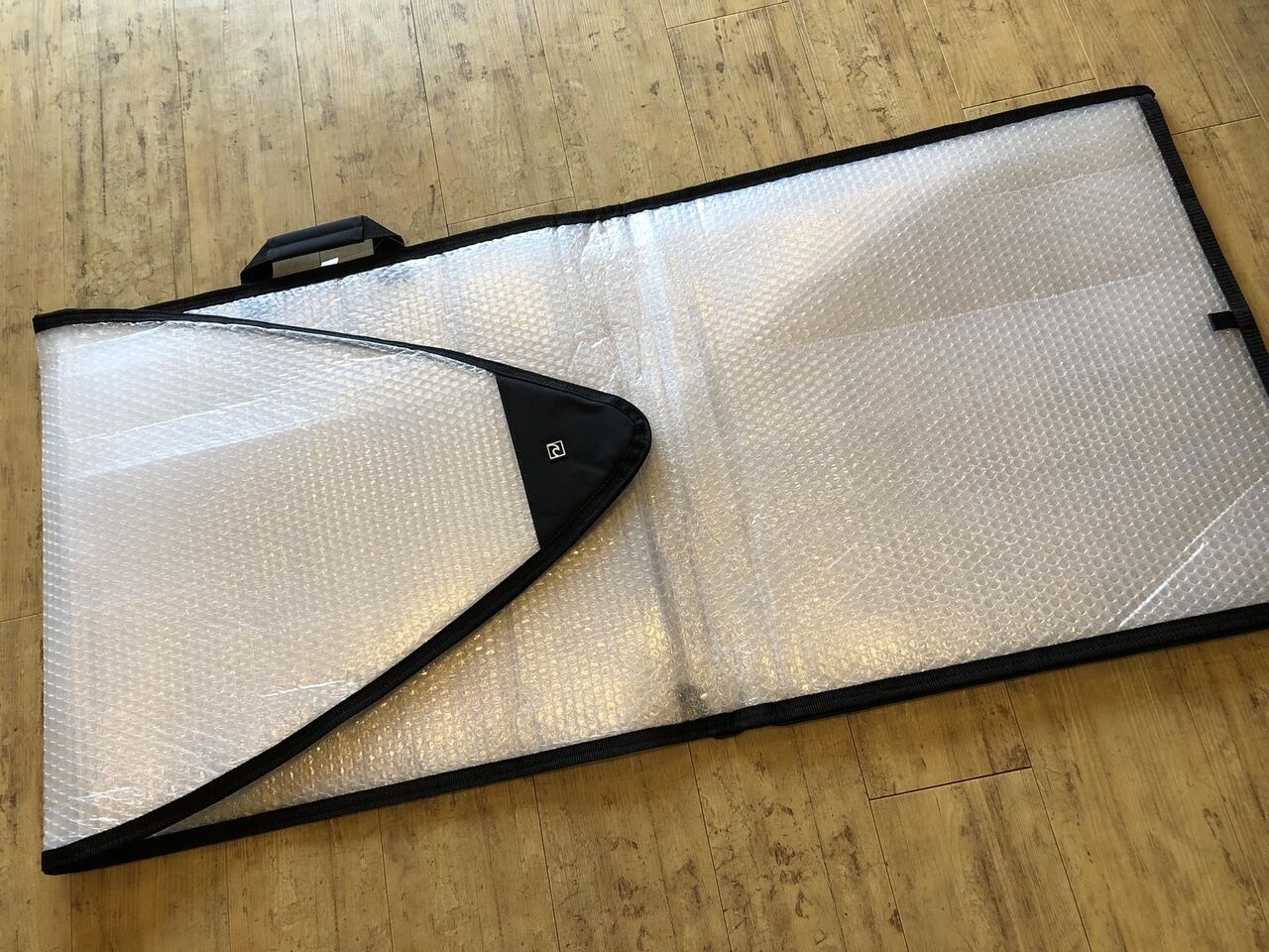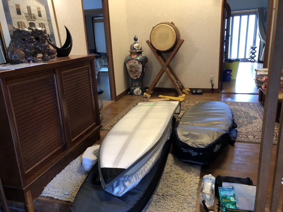このケースにサーフボードを入れてハードケースに入れたら、行きも帰りも面倒な梱包をしなくて済みます。