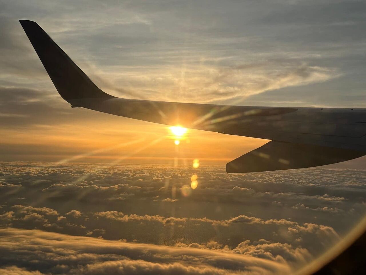 綺麗な夕暮れの中、窓際の乗客は写真や動画撮りで上空の思い出を残す。