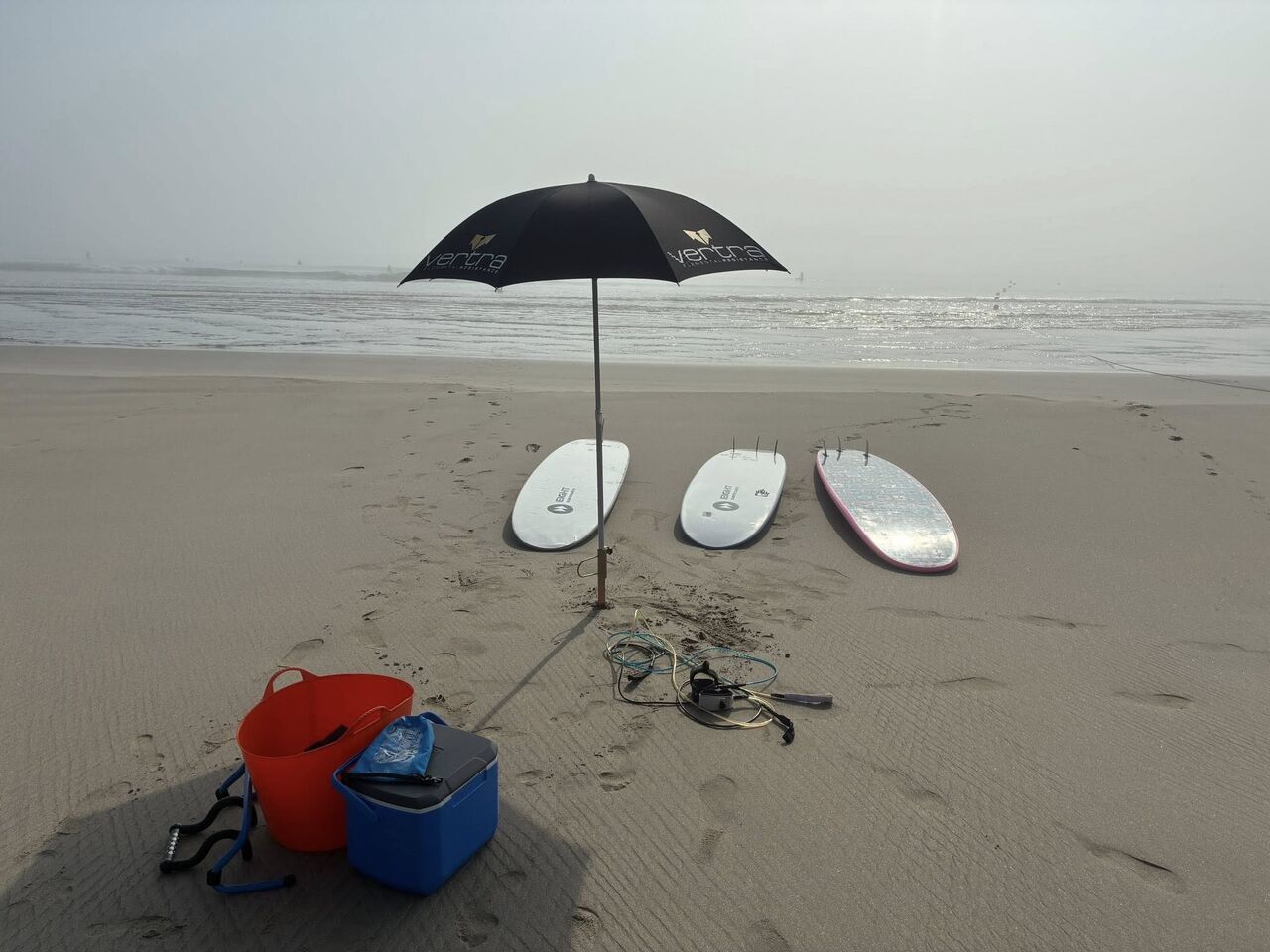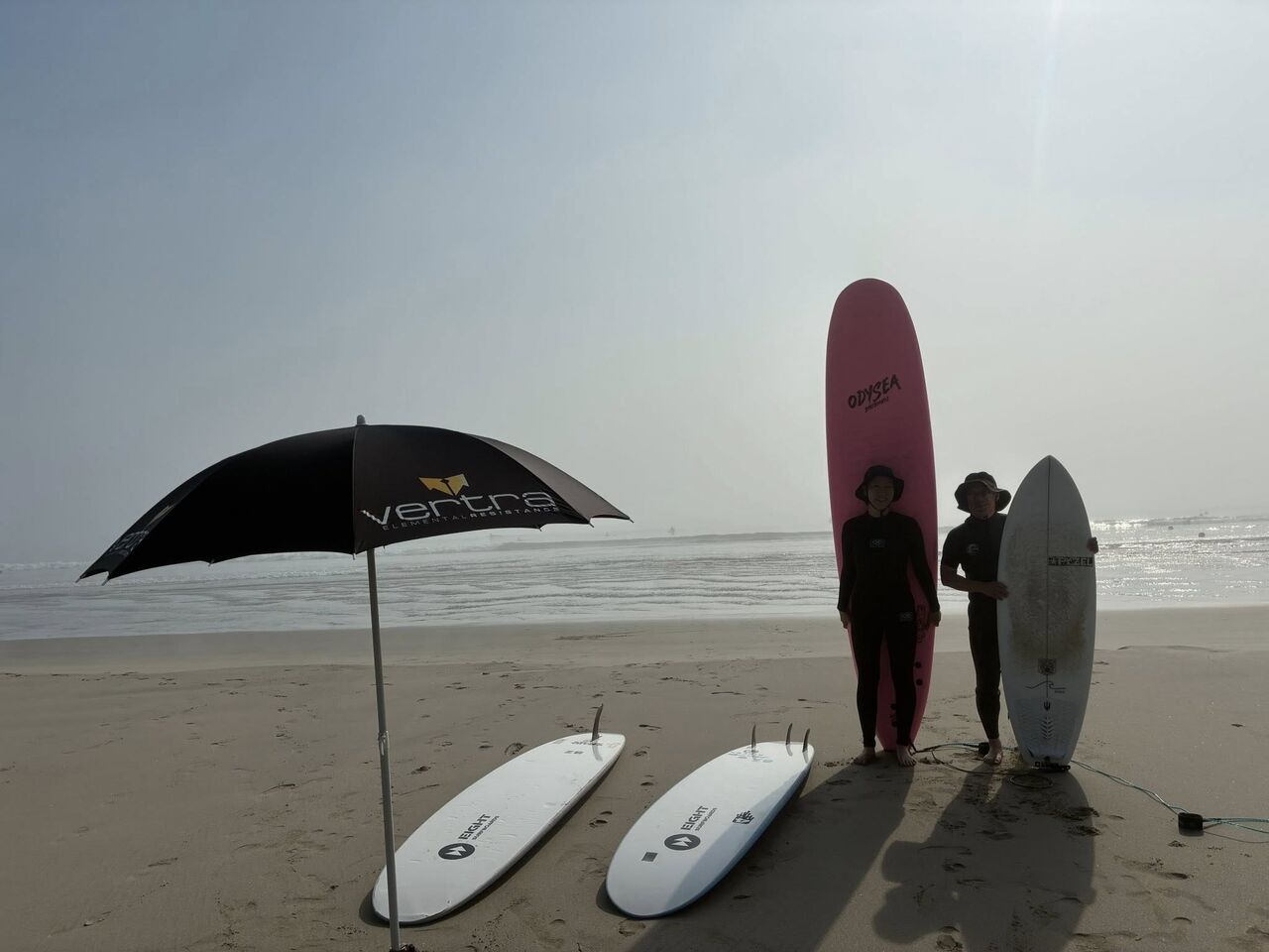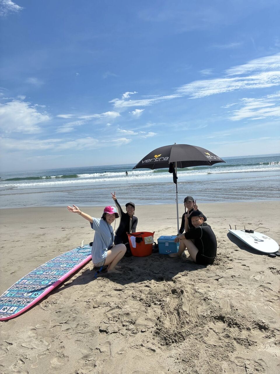 子育てでサーフィンお休み中のお客さんも遊びに来て、パラソルの下で休憩。