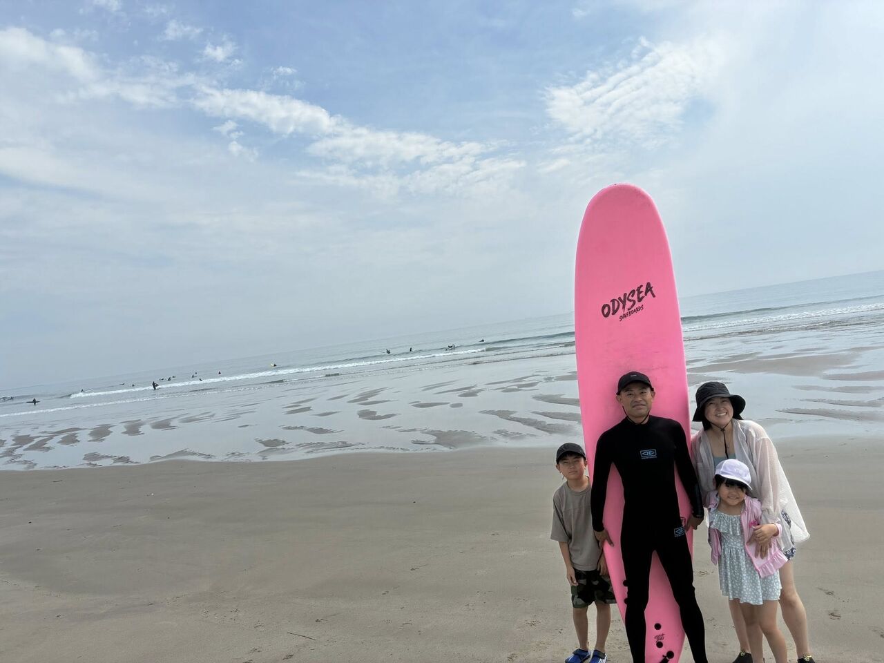 子供達が海水浴を楽しんでいる間、お父さんはサーフィン体験スクールに集中!